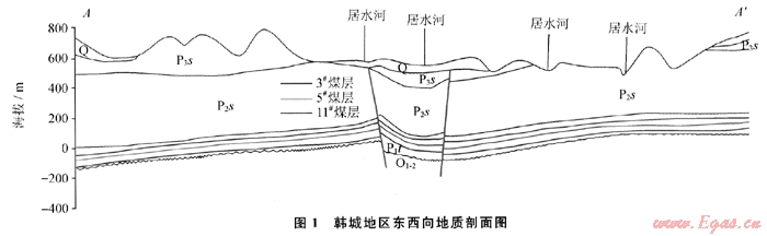 韓城地區(qū)隸屬于陜西省渭南市,地處關(guān)中平原的東北側(cè)。構(gòu)造上位于鄂爾多斯盆地渭北隆起的東南緣,東面以黃河和韓城大斷裂為界,南臨渭河地塹,西南與澄臺礦區(qū)毗鄰,面積約為1500km2。研究區(qū)構(gòu)造活動平穩(wěn),區(qū)域上由南向北、由東向西逐漸變?nèi)?,一般邊淺部相對于中深部復(fù)雜。北部以擠壓構(gòu)造變形為主,呈北東南西向;南部主要為拉伸構(gòu)造變形,有2個主導(dǎo)方向,即北東南西向和東西向,總體構(gòu)造形態(tài)是一個傾向北西的具波狀起伏的緩斜大型單斜構(gòu)造(圖1)。韓城地區(qū)主力產(chǎn)氣煤層分別為山西組3t煤層和太原組5#、11#煤層。山西組為陸相沉積,主要為河流沖積 三角洲沉積體系;太原組為海陸交互相沉積,主要為海灣一漏湖沉積體系。煤系地層基底為石炭系本溪組的鋁土質(zhì)泥巖[1~4]。