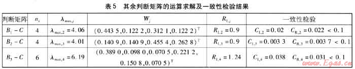當(dāng)CR,1<0.1時,說明此時判斷矩陣有可以接受的一致性。其余判斷矩陣(表2~4)的運算求解及一致性檢驗見表5。