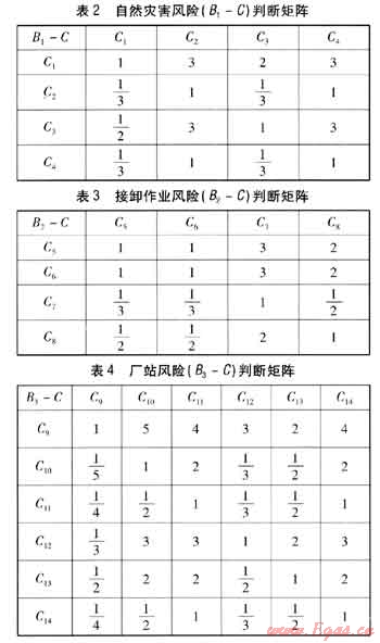 同樣,可以構(gòu)建以具體指標(biāo)層C的元素C1、C2、C3、…、C14相對于B層各指標(biāo)的兩兩對比判斷矩陣,詳見表2~4。元素兩兩對比的重要性采用1~9標(biāo)度法[8],并寫成判斷矩陣形式。構(gòu)造判斷矩陣后,即可通過計算判斷矩陣的最大特征值及其對應(yīng)的權(quán)重向量,也就是計算出某一層次的各個元素對于上一層次某一個元素的相對重要性權(quán)重。在計算出某一層次元素相對于上一層次各個因素的單排序權(quán)重后,用上一層次因素本身的權(quán)重加權(quán)綜合,即可計算出C層各因素相對于4層的層次總排序的權(quán)重。此外,為了評價經(jīng)所構(gòu)造的判斷矩陣求出的最大特征值及其對應(yīng)的權(quán)重向量是否合理,需對判斷矩陣進(jìn)行一致性隨機檢驗[9~10],檢驗各個專家對各指標(biāo)相對權(quán)重判斷的邏輯是否順暢。