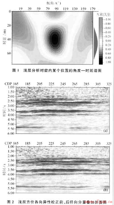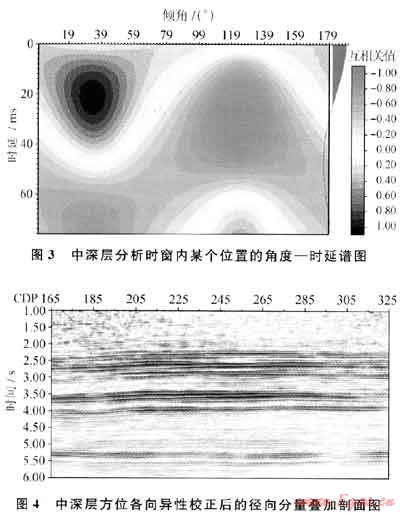 圖1為淺層分析時窗內(nèi)某個CDP位置的角度一時延圖,從圖1中可以看出,該位置的各向異性方向約90°(即東西方向),快慢橫波時差超過40ms,表明淺層各向異性特征明顯。圖2是淺層方位各向異性校正前后的徑向分量疊加剖面對比,從圖2中可以看出,經(jīng)過方位各向異性校正后的剖面的連續(xù)性得到了較大的提高,有效反射得到了加強,成像質(zhì)量得到了明顯的改善。與此同時,淺層分析時窗以下的徑向分量數(shù)據(jù)的能量也發(fā)生了變化,說明各向異性具有“傳遞”作用,上層的各向異性會影響下層。