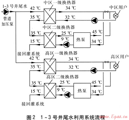 1~3號井尾水混合后的溫度約42℃,經兩次換熱后回灌。中區(qū)與高區(qū)并聯(lián),均通過一級換熱器提供基礎負荷,不足部分負荷由熱泵提供。地熱水回灌溫度約15℃。