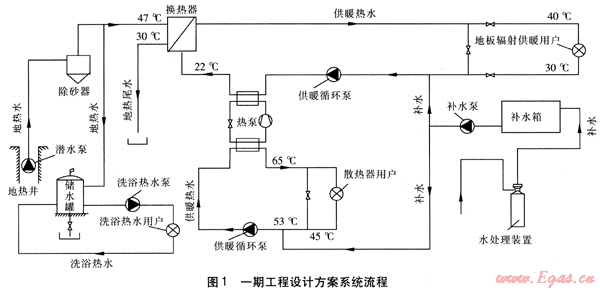 Key words:geothermal water;water source heat pump;radiant floor heating;hot water for bath