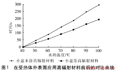 測試平臺(tái)如下:兩個(gè)一樣的不銹鋼小盆,直徑為160mm,一個(gè)在盆底涂刷高輻射材料,另一個(gè)不涂,小盆裝相同的水,在相同的電爐上測試水的升溫時(shí)間,多次測量后,取平均值。在受熱體外表面應(yīng)用高輻射材料前后的對(duì)比曲線見圖1。