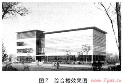 綜合樓建筑風(fēng)格簡潔現(xiàn)代,結(jié)合總圖采取矩形布局,建筑朝向為南北向,長邊與廠外主要道路平行。建筑體型采用三個不同高度的體塊相間穿插布置,顯得錯落有致。建筑外檐采用帶形熱反射玻璃幕墻與鋁合金金屬幕墻相結(jié)合,線條流暢,給人一種十足的現(xiàn)代感。局部安放空調(diào)室外機(jī)組的屋面采用金屬百葉做圍護(hù)結(jié)構(gòu),既對設(shè)備起到了視覺上的遮擋作用,本身又成為外立面不可或缺的重要組成部分,可謂一舉兩得??v觀整個建筑,本身并不作繁冗裝飾,而是采用豐富的體型、干凈利落的細(xì)部刻畫以及協(xié)調(diào)大方的色彩取勝。而鋁合金金屬幕墻、熱反射玻璃幕墻、鋁合金裝飾百葉這些新材料的運(yùn)用,又使整個建筑顯得既簡潔明快,又不乏時代感,反映了工業(yè)建筑的精神,現(xiàn)代企業(yè)的氣質(zhì)也在這里得以彰顯。綜合樓效果圖見圖2。