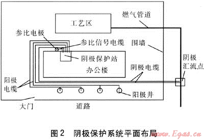 2008年為了保證福建LNG福州天然氣項目按期投產,福州華潤燃氣有限公司在福州城門建設管輸天然氣門站,同時為保護市政中壓燃氣管道,在城門門站新建外加電流深井陽極陰極保護系統(tǒng)。該陰極保護系統(tǒng)平面布局見圖2。