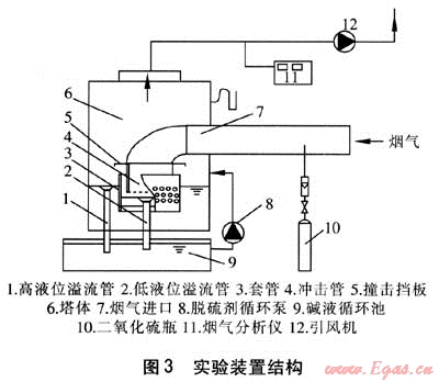 以石灰漿液為脫硫劑的雙液位噴射鼓泡煙氣脫硫除塵實(shí)驗(yàn)裝置結(jié)構(gòu)見圖3,模擬煙氣垂直進(jìn)入沖擊管在出口處卷吸液體向上流動(dòng),此過程中煙氣被加濕冷卻,煙氣中的二氧化硫和煙塵與脫硫劑接觸被吸收和去除。經(jīng)除塵和脫硫后的煙氣轉(zhuǎn)向向上流動(dòng),在撞擊擋板作用下水霧被分離,凈化后的煙氣由引風(fēng)機(jī)排出。脫硫劑循環(huán)泵將脫硫劑不斷補(bǔ)入塔內(nèi)以保證塔內(nèi)液位,正常工作時(shí)脫硫劑通過高液位溢流管進(jìn)行循環(huán)。調(diào)整二氧化硫瓶的閥門,可以改變二氧化硫濃度,通過測壓管可以測得在不同煙氣流量下的裝置阻力。煙氣分析儀可以測出煙氣中二氧化硫濃度的瞬時(shí)值和積分值。實(shí)驗(yàn)規(guī)模:模擬煙氣量200~1000m3/h,煙氣進(jìn)口處二氧化硫質(zhì)量濃度700~850mg/m3,空塔流速1~3m/s。