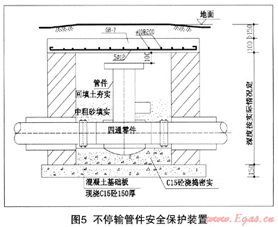 (1) 為確保管網(wǎng)安全運(yùn)行,對(duì)無法滿足規(guī)范要求埋深的管道、管件按圖5所示增加安全保護(hù)裝置。該保護(hù)裝置適用于機(jī)動(dòng)車道、非機(jī)動(dòng)車道及其他路段的不停輸作業(yè)施工。施工時(shí)基地要密實(shí)且避免雨天施工,混凝土基礎(chǔ)板與管底間必須用素混凝土澆搗密實(shí);蓋板為預(yù)制可移動(dòng)且上方預(yù)留探孔,方便今后日常維護(hù)。在開挖條件許可的情況下,可采用四通管件底部開孔預(yù)制連接施工法滿足規(guī)范埋深要求。