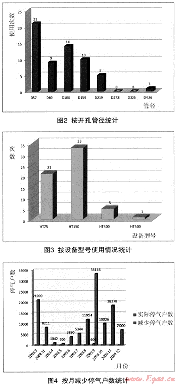 從統(tǒng)計(jì)圖中可以發(fā)現(xiàn),主要使用的設(shè)備為HT75、HT150系列,約占總數(shù)的90%,主要使用在帶氣開旁通,約占71%,管徑集中在D57—D159,約占90%,在施工過程減少停氣用戶約120000戶,減少了約6400m3燃?xì)獾娜紵欧?,?jié)約1900m3的氮?dú)庵脫Q,避免了約4360h/人·次夜間施工作業(yè)。