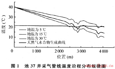 圖1為池37井在井口溫度為40℃時(shí),不同地溫下的沿程溫度分布及天然氣水合物生成曲線圖。從圖上可以看到管線高程對(duì)管線沿線壓力、溫度影響非常大,而且隨著管線位置變化,壓力的變化引起各點(diǎn)的天然氣水合物生成溫度也發(fā)生了變化。管線進(jìn)站溫度最低,并不是在此處形成的天然氣水合物溫度最低,因此進(jìn)行管線設(shè)計(jì)時(shí)要綜合考慮預(yù)測(cè)天然氣水合物形成溫度,不能僅以終點(diǎn)不形成天然氣水合物,就認(rèn)為管線沿程都不生成天然氣水合物。