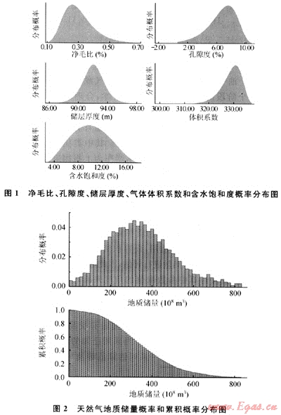 該實(shí)例為我國(guó)西部某氣田實(shí)際數(shù)據(jù)。由地球物理測(cè)井解釋和巖心、流體取樣實(shí)驗(yàn)得到已鉆評(píng)價(jià)井的靜態(tài)數(shù)據(jù),包括儲(chǔ)層厚度,凈毛比(NTG)、儲(chǔ)層孔隙度、含水飽和度、氣體體積系數(shù)等,采用容積法儲(chǔ)量計(jì)算公式和Crystall ball[5]蒙特卡羅模擬方法計(jì)算氣藏地質(zhì)儲(chǔ)量。