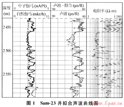 統(tǒng)計數(shù)學(xué)模型的復(fù)相關(guān)系數(shù)達(dá)0.89,統(tǒng)計量F=7834,表明所建立的人工擬合方程是“高度顯著”的;再將人工擬合的聲波曲線與實際測量的聲波曲線進(jìn)行對比(圖1),二者形態(tài)一致性良好,曲線大部分近于重合,表明選用人工擬合聲波曲線大體上可以滿足計算地層孔隙度的基本需要。