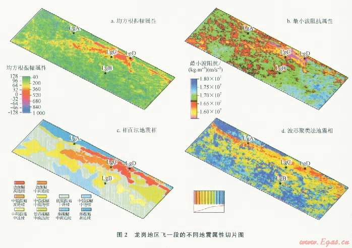 地震相識別技術(shù)采用了相面法定性分析和波形聚類半定量分析,利用這兩種地震相識別技術(shù)對飛仙關(guān)組鮞粒灘體進(jìn)行預(yù)測,認(rèn)為用相面法來劃分地震相能粗框架的限定鮞粒灘體的發(fā)育部位(圖2-c),再有針對性地對灘體發(fā)育部位利用波形聚類法進(jìn)行地震相劃分(圖2-d)能更精細(xì)地識別灘體。