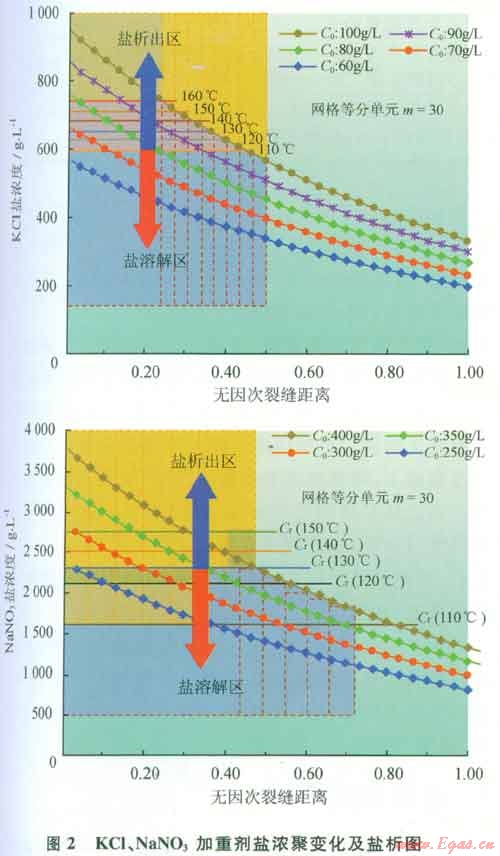 采用以上模擬原則,以KCl、NaN03加重液為例,分析加重液在高溫高壓氣藏增產(chǎn)過程中鹽析過程。圖2是KCl、NaN03模擬鹽濃聚變化和鹽析結(jié)果圖。從圖可看出,即使地面使用加重液鹽度遠(yuǎn)低于該溶液的臨界飽和溶解度,但在高溫地層返排過程中加重液經(jīng)過逐漸濃聚后極易產(chǎn)生鹽析。如采用70g/L的KCl鹽水和250g/L的NaN03鹽水,20℃時(shí)其臨界飽和溶解度分別為254.8g/L和467g/L,但在高溫地層返排過程中經(jīng)過逐漸濃聚后,在距裂縫壁附近液體鹽度可高達(dá)620g/L和2000g/L以上,超過溫度110℃時(shí)兩者的臨界飽和鹽度(其臨界飽和鹽度分別為600g/L和1940g/L),部分鹽將從溶液中結(jié)晶析出,即產(chǎn)生鹽析現(xiàn)象。該濃度低于130℃時(shí)兩者的臨界飽和溶解度,因此當(dāng)返排溫度為130℃時(shí),溶液無鹽析現(xiàn)象屬于穩(wěn)定狀態(tài)。