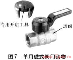 圖7閥門為可實現(xiàn)可關(guān)不可開功能的單用磁式閥門,閥門關(guān)閉后只能通過專用開啟工具才能實現(xiàn)自由開啟。該結(jié)構(gòu)關(guān)鍵技術(shù)在于閥體有扇形凸臺,在扇形凸臺的軸向端和徑向端分別設置相垂直的兩個盲孔,手柄按閥體扇形凸臺徑向和軸向相垂直盲孔對應位置分別開設相對應的盲孔。閥體扇形凸臺上軸向和徑向盲孔和手柄內(nèi)的磁銷、彈簧能準確地按對應預設盲孔插入,即可實現(xiàn)可關(guān)不可開功能。當閥門需要正常工作時,只能通過專用開啟工具內(nèi)的強磁與閥內(nèi)的磁銷通過磁場“同性相斥,異性相吸”的原理實現(xiàn)自由開啟閥門。產(chǎn)品出廠時一般設置為開啟狀態(tài)。