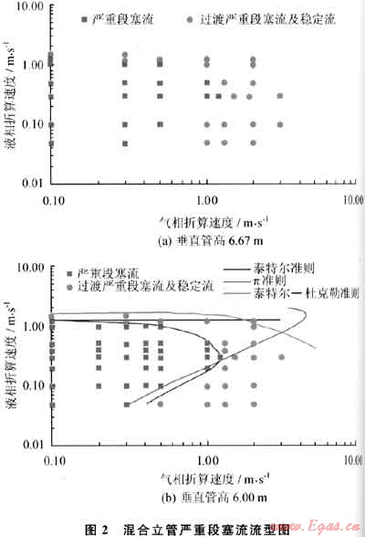 筆者將混合立管液塞長(zhǎng)度達(dá)到或超過(guò)整個(gè)立管長(zhǎng)度的段塞流劃為嚴(yán)重段塞流;將液塞長(zhǎng)度小于立管長(zhǎng)度但是有液塞堵塞立管底部的段塞流劃為過(guò)渡嚴(yán)重段塞流;將水力學(xué)段塞流、氣泡流、氣團(tuán)流和環(huán)狀流劃為穩(wěn)定流。圖2-a、2-b為下傾管傾角為-2°、立管總高度為7.00m、U形柔性管長(zhǎng)度為2.20m、水平跨度為1.50m,垂直管高度分別為6.67m和6.00m的混合立管嚴(yán)重段塞流流型圖。從圖2可以看出,混合立管嚴(yán)重段塞流發(fā)生在氣液相流量都較小的工況下。對(duì)比圖2-a和圖2-b,發(fā)現(xiàn)嚴(yán)重段塞流的范圍相差很小,垂直管高度為6.67m的混合立管嚴(yán)重段塞流范圍要稍大一點(diǎn)。