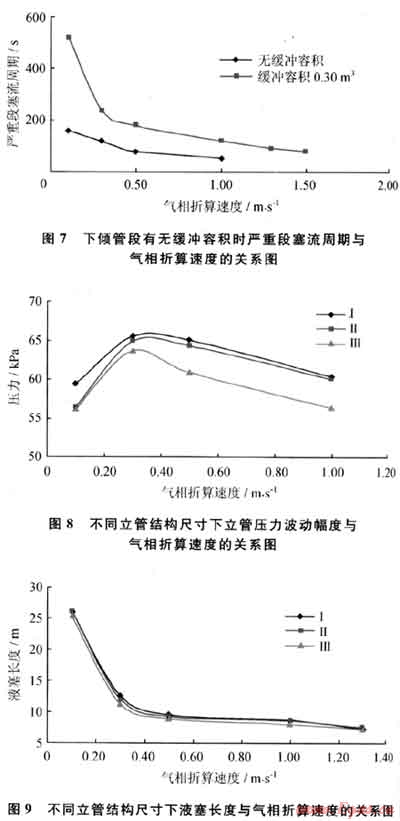 在液相折算速度為0.10m/s的情況下,嚴(yán)重段塞流周期在下傾管段有無(wú)緩沖容積時(shí)與氣相折算速度的關(guān)系如圖7所示。不同立管結(jié)構(gòu)尺寸下,立管壓力波動(dòng)幅度與氣相折算速度的關(guān)系如圖8所示,液塞長(zhǎng)度與氣相折算速度的關(guān)系如圖9所示。圖8、9中的Ⅰ和Ⅱ分別代表總高度為7.O0m,U形柔性管總長(zhǎng)為2.20m,垂直管段高6.67m,U形柔性管水平跨度分別為1.50m和1.20m的混合立管;Ⅲ代表自由站立式立管總高度為7.O0m,U形柔性管總長(zhǎng)2.20m,垂直管段高6.O0m,U形柔性管水平跨度為1.50m的混合立管。