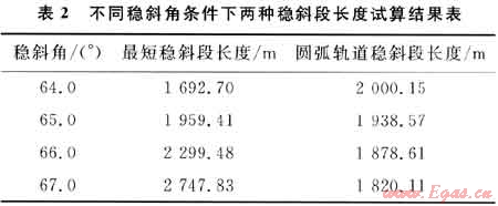 在確定合理的穩(wěn)斜角上,利用上述軌道設計方法對不同軌道進行計算,設計出各種軌道對應的關鍵參數、節(jié)點參數和分點數據;然后從井眼長度、最大狗腿度和增斜段長等方面,對不同設計軌道進行幾何形狀評價。