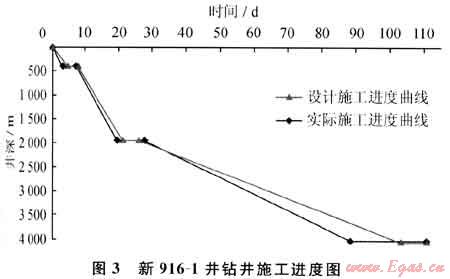 從本井時效分析結(jié)果可知,全井鉆井總臺時為2121.5h,臺月效率為1366.10m/臺月,高于設(shè)計值15.94%;純鉆率為57.31%,高于沒計值15.26%;全井平均鉆速為3.31m/h,高于設(shè)計值0.61%。事故率為0,鉆井周期為88.4d,平均機械鉆速為3.31m/h,實現(xiàn)了以須四段為目的層的4000m定向深井105d完鉆的提速奮斗目標(biāo),并較提速目標(biāo)提前16.60d,創(chuàng)造了川西地區(qū)4000m定向深井鉆井周期最短紀(jì)錄(施工進度如圖3所示)。