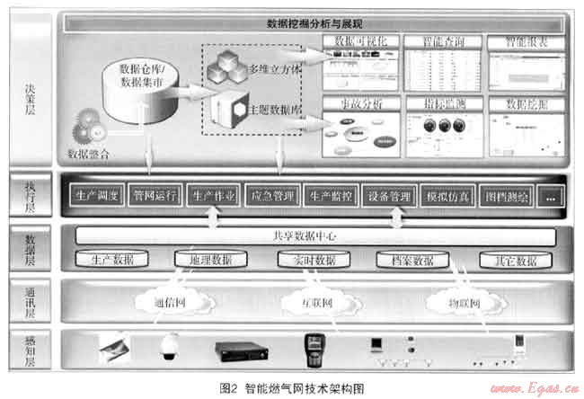 智能燃?xì)饩W(wǎng)是一個綜合的系統(tǒng)建設(shè)工程,它主要包括5個層次:物理感知層、網(wǎng)絡(luò)通訊層、共享數(shù)據(jù)層、運(yùn)營執(zhí)行層、決策分析層。如圖2所示。