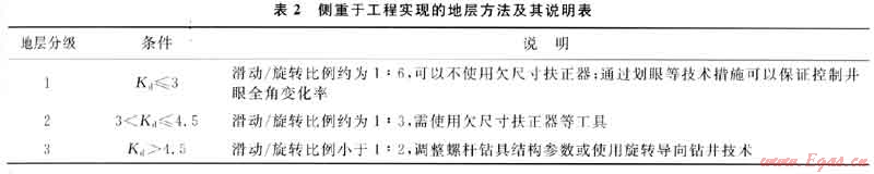 基于上述認(rèn)識(shí),可進(jìn)而提出以工程實(shí)現(xiàn)能力為依據(jù)的地層分級(jí)方法。即根據(jù)井眼尺寸和地層對(duì)于鉆井手段的響應(yīng)效果進(jìn)行分級(jí)。例如,在大牛地氣田,根據(jù)地層可鉆性級(jí)值,Φ215.9mm井眼可以將地層分為3級(jí)(圖3)。地層可鉆性級(jí)值(Kd)小于3的可劃分為I級(jí),對(duì)應(yīng)的復(fù)合鉆進(jìn)全角變化率小于3.5°/100m,即復(fù)合鉆進(jìn)60m,井斜最大增加2.1°,使用1.25°單彎動(dòng)力鉆具滑動(dòng)鉆進(jìn)10m左右即可控制井眼軌跡?;瑒?dòng)鉆進(jìn)與旋轉(zhuǎn)鉆進(jìn)的比例接近1:6。實(shí)際施工中,當(dāng)所鉆地層Kd<3時(shí),可以使用“鉆頭+單彎螺桿動(dòng)力鉆具+無磁鉆具+……”的常用鉆具組合,通過多次劃眼、控制鉆壓等方法均可有效降低復(fù)合鉆進(jìn)井段的全角變化率。根據(jù)地層可鉆性級(jí)值選擇底部鉆具組合及井眼軌跡控制的方法見表2。