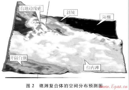 在精細(xì)層位對(duì)比解釋的基礎(chǔ)上,基于古地貌恢復(fù)的生物礁灘三維成圖,便可繪制出礁灘復(fù)合體的空間分布圖。圖2為根據(jù)三維地震資料繪制的飛仙關(guān)組沉積前古地貌展布網(wǎng),反映了長(zhǎng)興組生物礁的空間展布,早期在臺(tái)地內(nèi)形成了灘相沉積,隨著長(zhǎng)興期生物礁快速生長(zhǎng)和加積,在臺(tái)地邊緣形成生物礁灘復(fù)合帶。礁灘復(fù)合體空間分布圖確定后,相應(yīng)的沉積相帶也可解釋出來(lái),圖中可明顯地劃分出陸棚、斜坡、臺(tái)地邊緣礁、臺(tái)內(nèi)灘、開闊臺(tái)地等相帶。