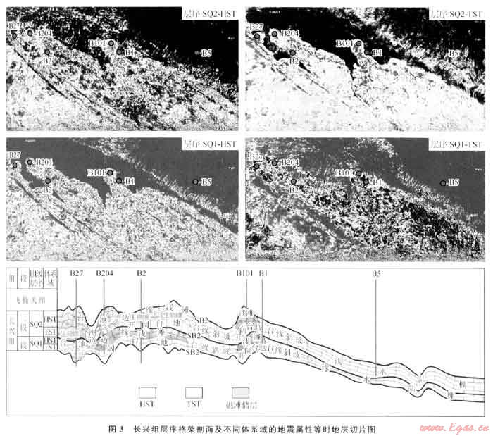 圖3是在長(zhǎng)興期層序格架劃分基礎(chǔ)上,對(duì)兩個(gè)Ⅲ級(jí)層序中控制儲(chǔ)層發(fā)育的體系域進(jìn)行地震屬性的等時(shí)地層切片,能較好地反映了長(zhǎng)興組礁、灘體的發(fā)育和演化規(guī)律。長(zhǎng)一段下部為海侵體系域(SQ1-TST),B1井及以西地區(qū)為開闊臺(tái)地相沉積,B1井以東相變?yōu)榕_(tái)地邊緣斜坡陸棚沉積,儲(chǔ)層不發(fā)育。長(zhǎng)一段上部為高位體系域(SQ1-HST),B5井西南地區(qū)為臺(tái)地邊緣淺灘相沉積,淺灘相儲(chǔ)層發(fā)育;B1井以東相變?yōu)榕_(tái)地邊緣斜坡陸棚沉積,地層薄,儲(chǔ)層不發(fā)育。長(zhǎng)二段下部為海侵體系域(SQ2-TST),B5井以西南地區(qū)為開闊臺(tái)地相沉積,局部地勢(shì)較高部位(如B101井)發(fā)育生屑白云巖儲(chǔ)層;B1、B5井以東地區(qū)相變?yōu)榕_(tái)地邊緣斜坡 陸棚沉積,儲(chǔ)層不發(fā)育。長(zhǎng)二段上部為高位體系域(SQ2-HST),B5、B1井以西南地區(qū)為臺(tái)地邊緣礁灘沉積,儲(chǔ)層發(fā)育,物性好、厚度大、分布廣;B1、B5井以東地區(qū)相變?yōu)榕_(tái)地邊緣斜坡-陸棚沉積,儲(chǔ)層不發(fā)育。因此,長(zhǎng)興組的儲(chǔ)層明顯受到沉積體系域的控制,主要發(fā)育在高位體系域內(nèi)的臺(tái)地邊緣礁灘相中,并且表現(xiàn)為早期以灘相沉積為主,晚期以礁相沉積為主,平面上具有前礁后灘的特點(diǎn)。